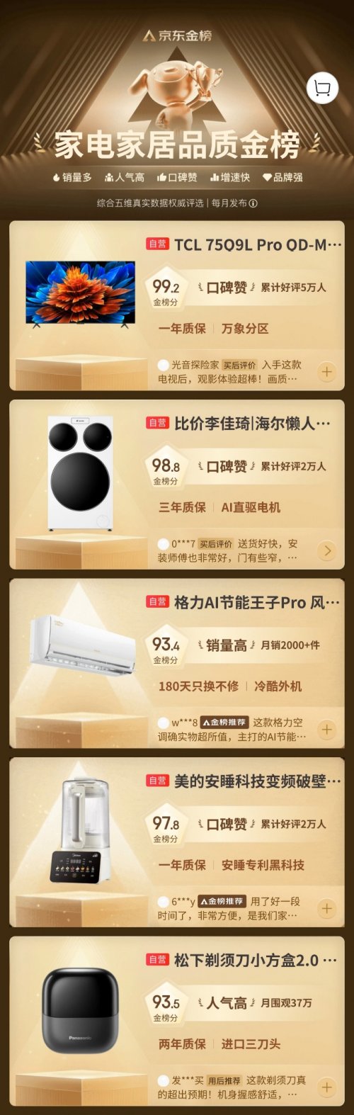 更有“家电家居品质金榜”,将京东家电家居品质实验室测评的好产品带给消费者。其中海尔懒人三筒洗衣机、格力AI节能王子Pro空调、美的安睡变频破壁机、松下小方盒2.0无线剃须刀、西门子锥锋Plus超薄速吸静音油烟机等产品上榜。这些产品不仅具备卓越性能,更精准契合当前消费者对“分区健康洗护”“AI节能管理”“静音厨房体验”等精细化生活场景的升级需求,反映出用户从“满足基础功能”向“追求品质体验”的明显转变。