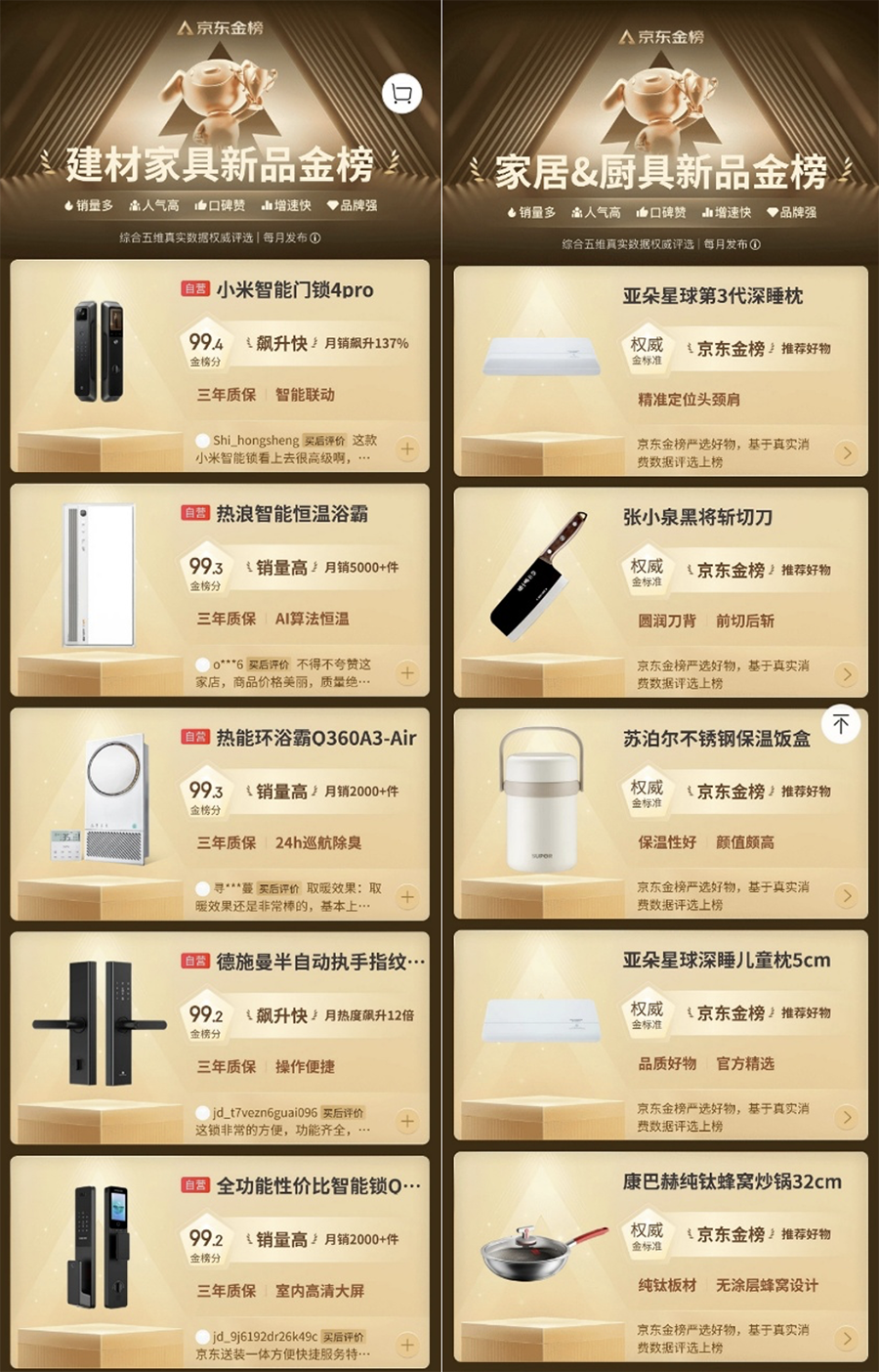 “又好又便宜”的京东11.11正如火如荼进行,消费者在家电家居品类的选择上正从过去追求实用、性价比,逐步转向追逐更加品质的体验。为帮助消费者更精准、省心地选购高品质商品,京东家电家居品质检测实验室携手京东金榜上线推出多维度新品榜单,基于真实平台大数据生成入榜商品,覆盖大家电、小家电、家具建材、家居厨具等核心品类,为消费者提供专业和权威的选购参考,真正实现“闭眼”放心买、不踩雷。