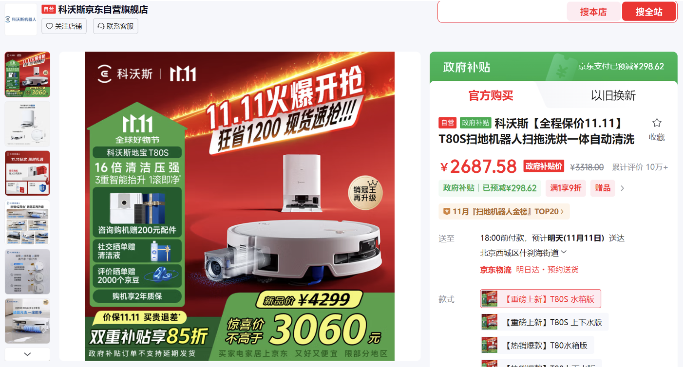 家中不止要除尘更要除污,科沃斯T80S扫地机器人能一次解决。搭载OZMO ROLLER 2.0恒压滚筒活水洗地专利,200次/分钟自清洁,实时刮走污水,杜绝以脏拖脏。16倍清洁强压,干涸酱渍、奶渍一滚即净。三重智能升降系统,自动识别干湿区与地毯,及时抬升,避免二次污染;京东11.11下单双重补贴享85折优惠,到手价2688元。