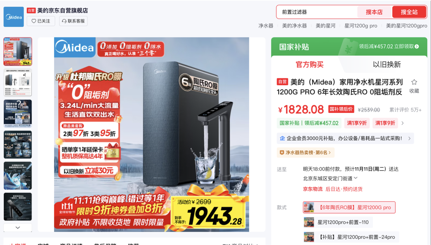 秋冬天气干燥,喝水频次增加。美的星河净水器1200G PRO,智慧触控龙头一键取水,用水状态一目了然。采用杜邦陶氏RO滤芯,出水鲜活,六年长效洁净,结合伯努利过滤技术,流速快更耐用。京东11.11期间限时9折,叠加国家补贴8折,到手价1828.08元。