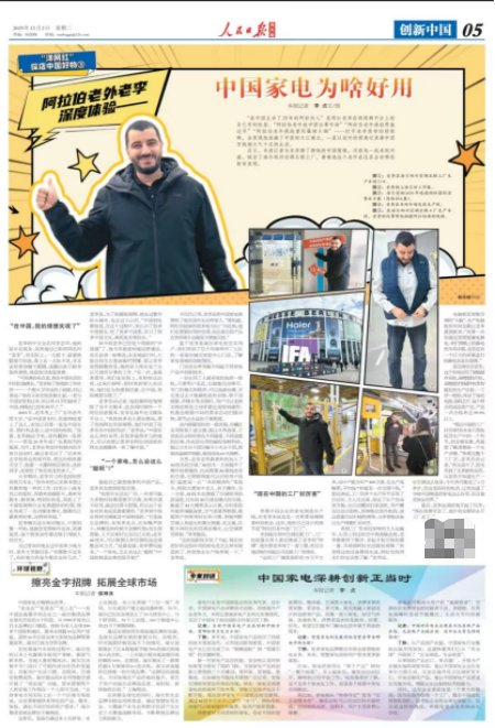 12月2日,《人民日报》海外版05版创新中国整版聚焦海尔,点赞其展现出的中国企业创新实力与全球视野。