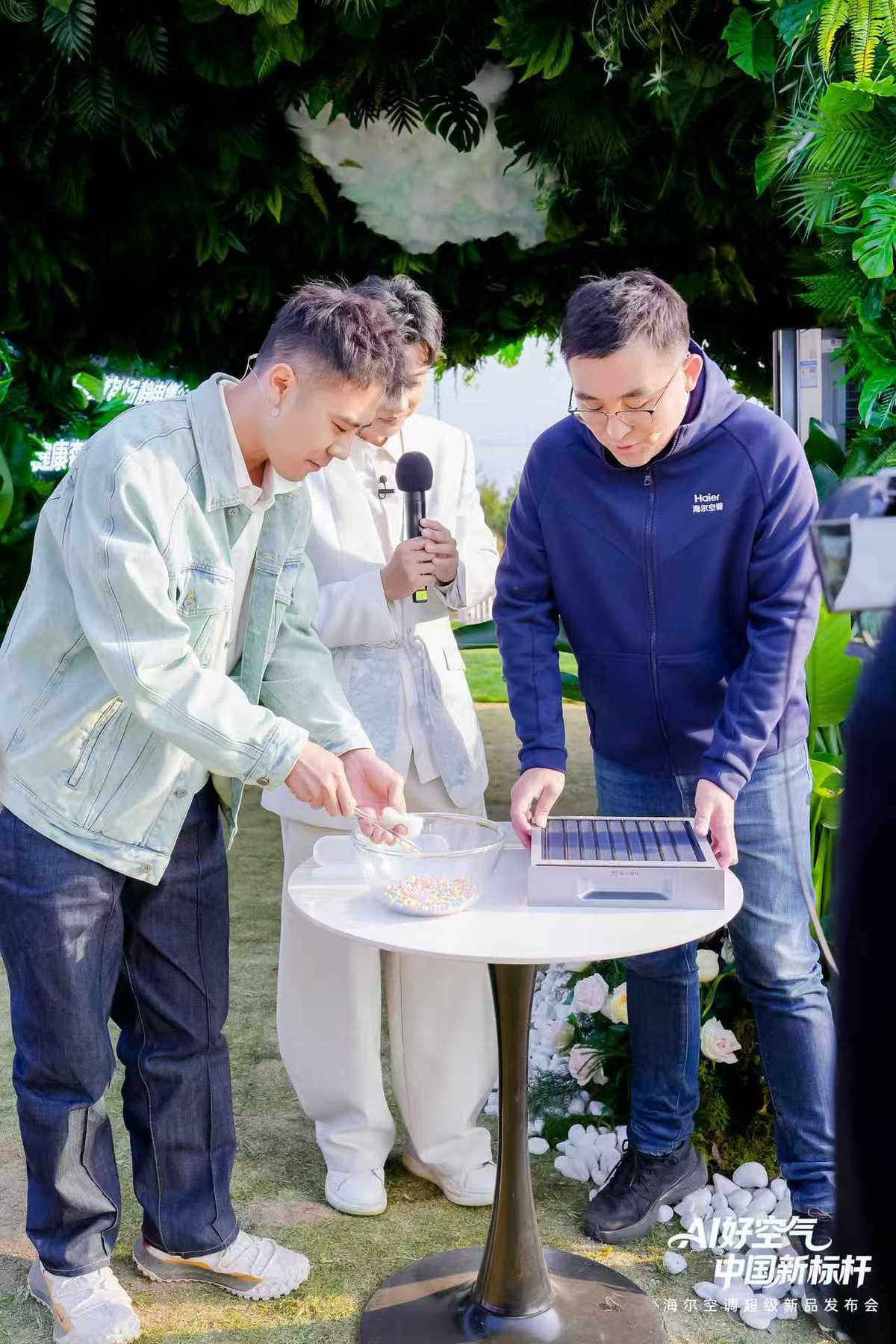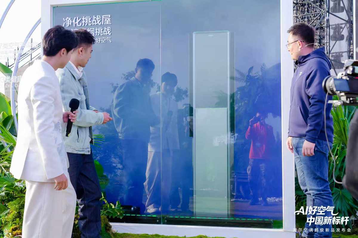 更直观的是玻璃房净烟挑战。烟雾机一开,透明玻璃屋里浓烟弥漫,PM2.5数值瞬间飙到999。开启洗空气功能,仅仅2分钟,浓烟消散。看得见的净化,让主持人和嘉宾直呼“震撼”。